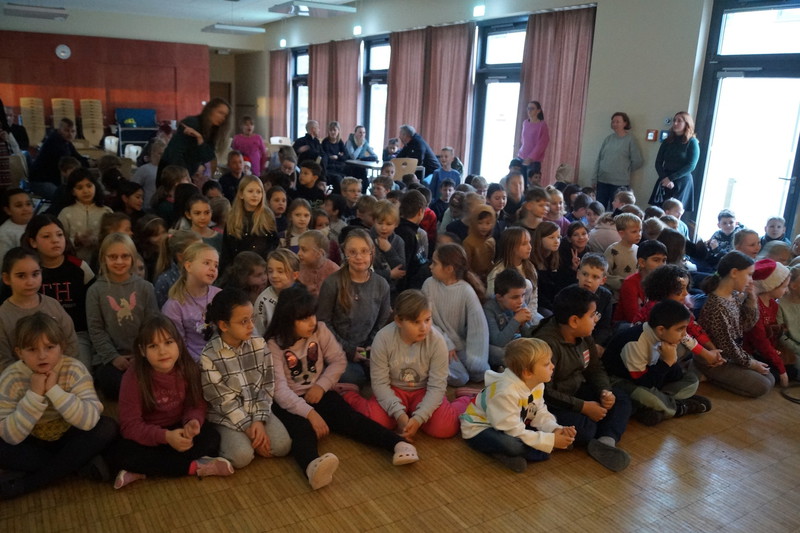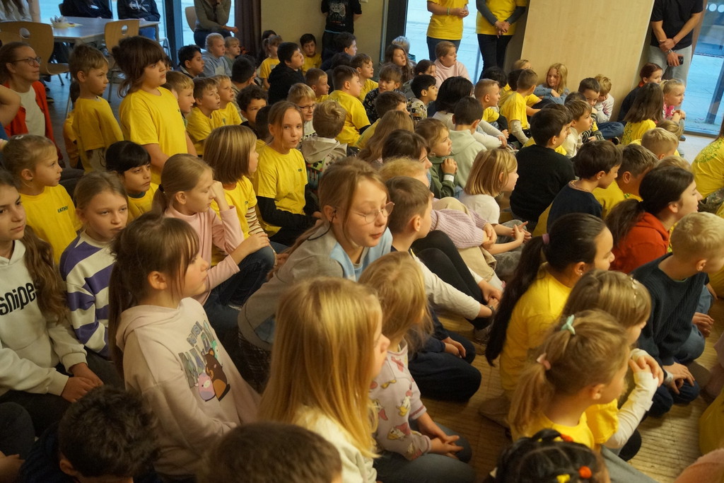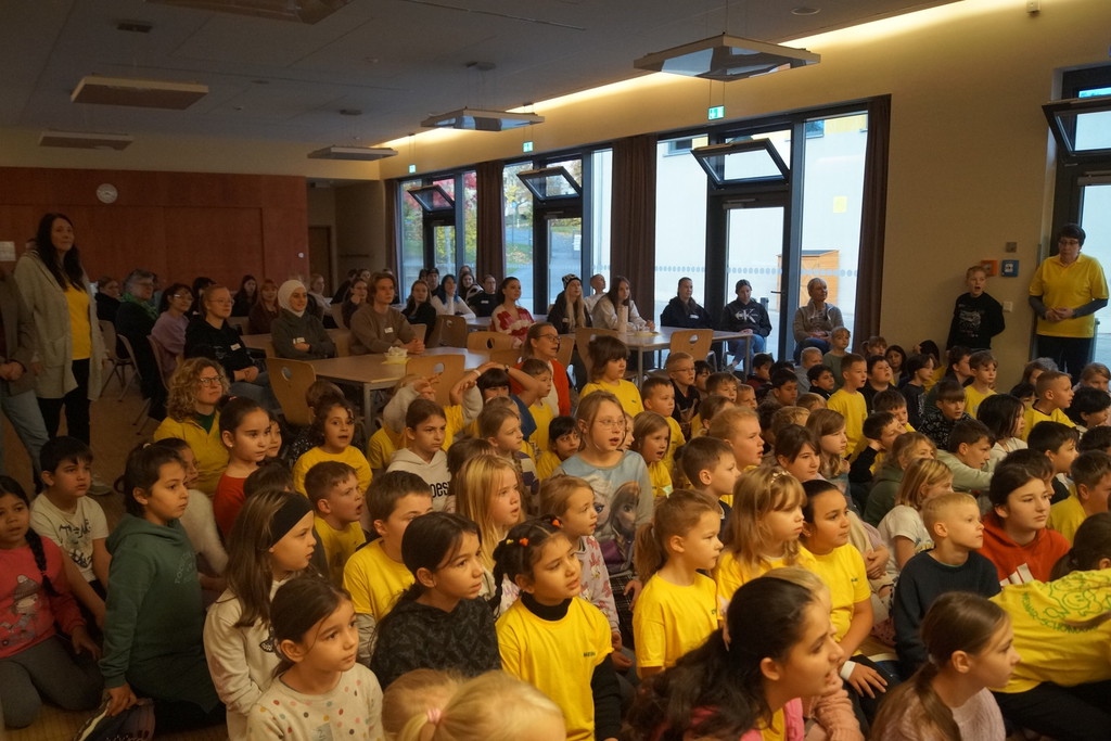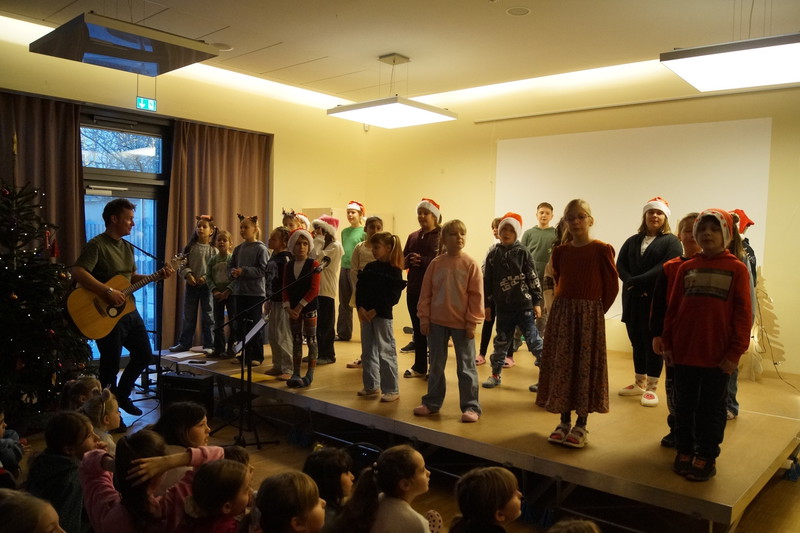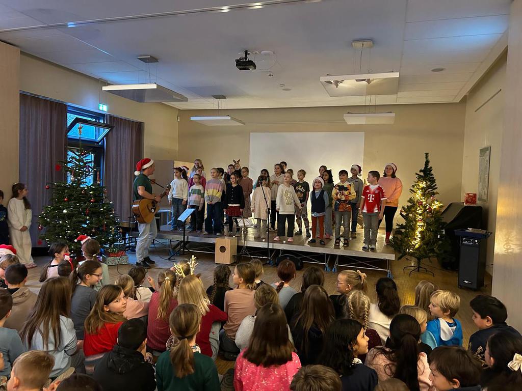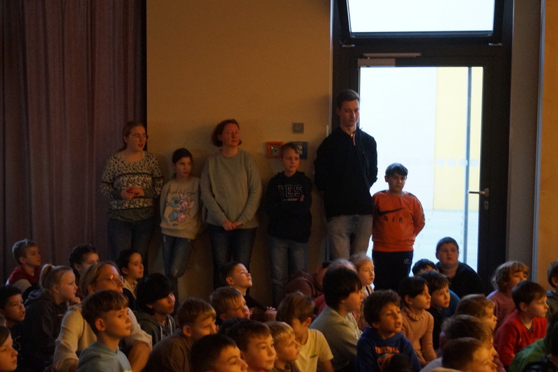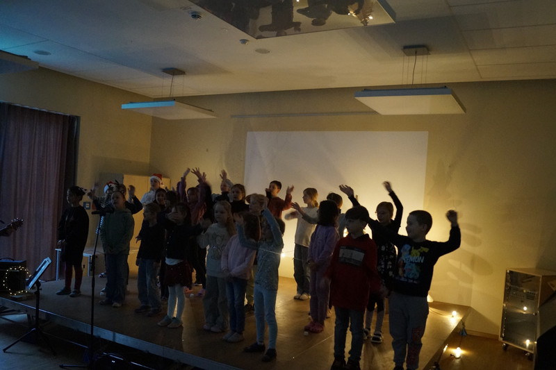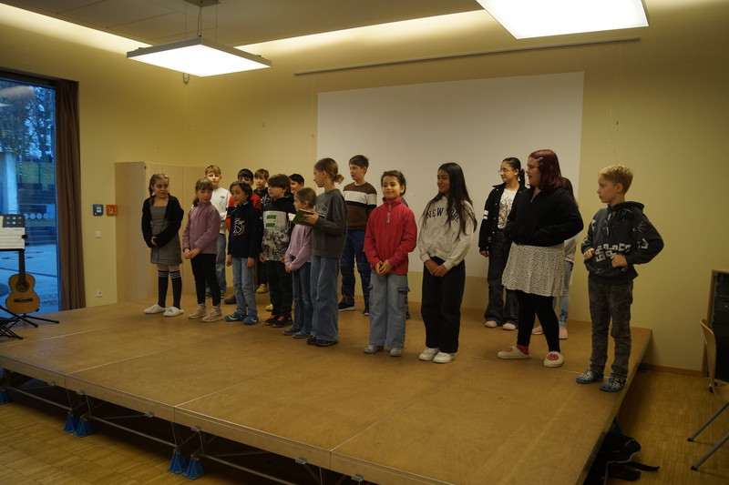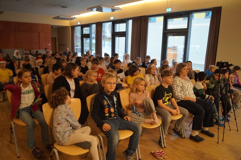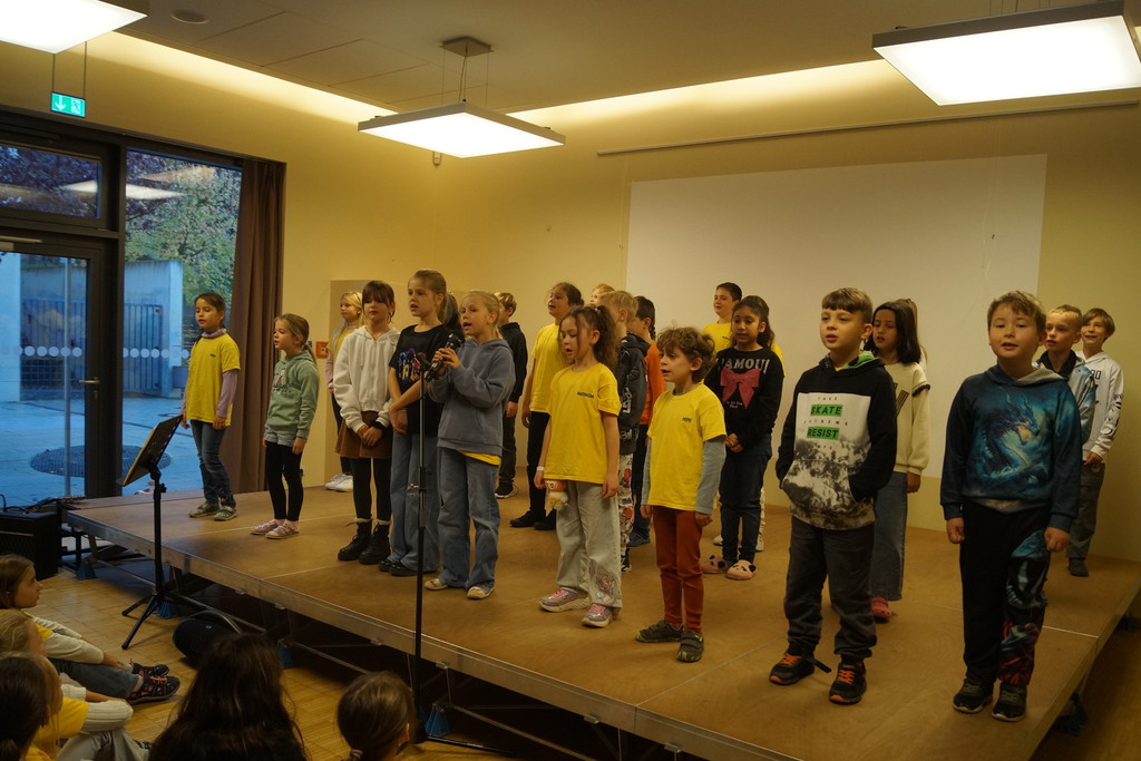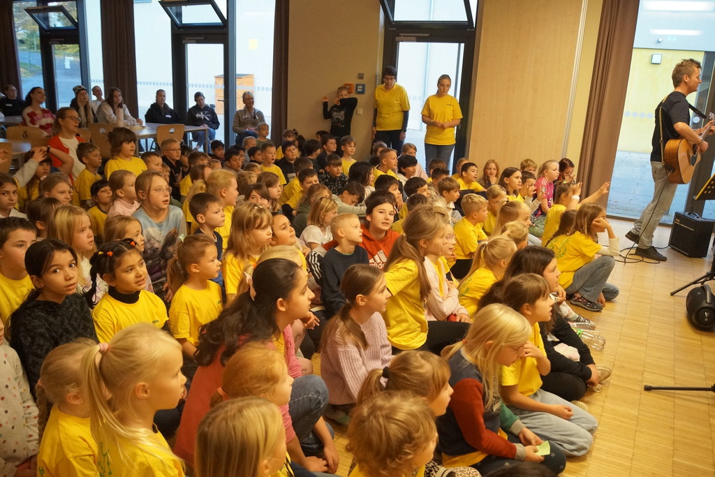 2.10.2025: Gemeinsames Singen vor den Herbstferien....und ganz mutige KInder spielten Gitarre, trugen ein Gedicht vor und zeigten einen Zaubertrick